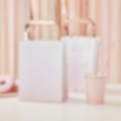 5 stuks papier uitdeelzakjes in een roze ombre en met roségouden foliestippen en hengsels uit de fijne collectie Mix it Up. Vul deze zakjes met iets lekkers of met wat verrassing en geef de zakjes aan je gasten tijdens het kinderfeestje of feestje. De uitdeelzakjes zijn ca 20 x 15 cm groot exclusief de hengsels.