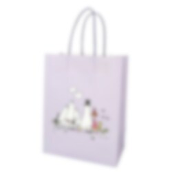 Cadeauzakje in lichtpaars pastel met een betoverende afbeelding uit de Moominvallei, waar Moomin en zijn vrienden je uitnodigen voor een magisch kinderfeestje.