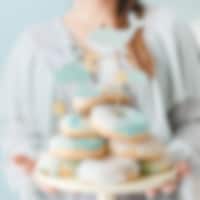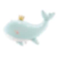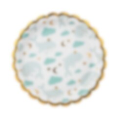 6 papieren bordjes in witte kleur met geel folie randen en met motieven van schattige kleine walvissen en goud folie sterren en halve manen. De bordjes zijn 18 cm in doorsnee.