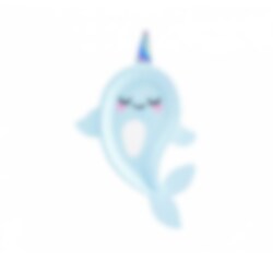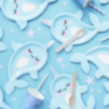 6 papieren plaatjes in de vorm van een blauwe kleine narwal. Een heel schattig accessoire voor op de feesttafel. De bordjes zijn ongeveer 18,5 x 29 cm groot.