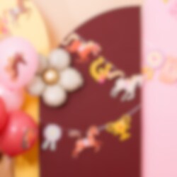 Een prachtige slinger met paarden, hoefijzers, rozetten en bekers in vrolijke kleuren – perfect voor een paardenfeestje of voor elke kleine paardenliefhebber! De slinger is 270 cm lang en de paarden zijn ongeveer 18,5 x 22 cm groot. De verpakking bevat een touw van 5 meter voor eenvoudige ophanging.