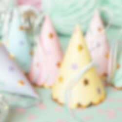 6 waanzinnig mooie feesthoedjes in schattige pastelkleuren met goudfolie randen en met motieven van sterren en linten in fijne kleuren. Een leuk detail om te hebben bij de tafelaankleding voor elk kinderfeestje of feestje.