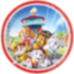8 papieren borden met kleurrijke afbeeldingen van de favoriete pups uit Paw Patrol. De borden hebben een diameter van ca. 23 cm en zijn gemaakt van FSC-gecertificeerd papier.