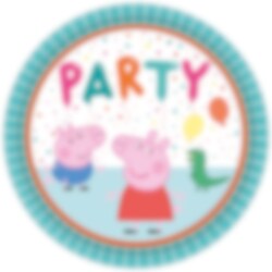 8 ronde papieren bordjes met oranje en turquoise randen, witte en lichtblauwe achtergrond en met motieven van Peppa Pig, George Pig een speelgoed-dinosaurus, kleurrijke confetti, ballonnen en de tekst "Party". De bordjes hebben een diameter van ongeveer 23 cm.
