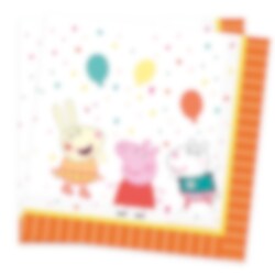 16 servetten met oranje en gele randen, witte achtergrond en met motieven van Peppa Pig en haar vrienden Rebecca Rabbit en Suzy Sheep, evenals kleurrijke ballonnen en confetti. De servetten hebben 2 lagen en zijn uitgevouwen 33 x 33 cm.