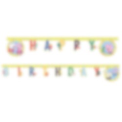 Mooie gele kartonnen slinger die het woord "Happy Birthday" vormt in kleurrijke kleuren en met motieven van Peppa Pig en haar vrienden uit de serie Peppa Pig. Hang deze slinger aan de muur voor een leuke decoratie voor het kinderfeestje. De slinger is ongeveer 2 meter lang.