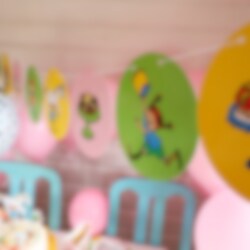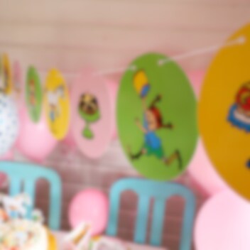 Kleurrijke slinger met afbeeldingen van Pippi en haar dierbare vrienden uit Pippi Langkous. Een indrukwekkende decoratie om op te hangen voor je Pippi-kinderfeestje. De slinger is gemaakt van karton, is 300 cm lang en de afbeeldingen zijn ongeveer 16 cm groot.