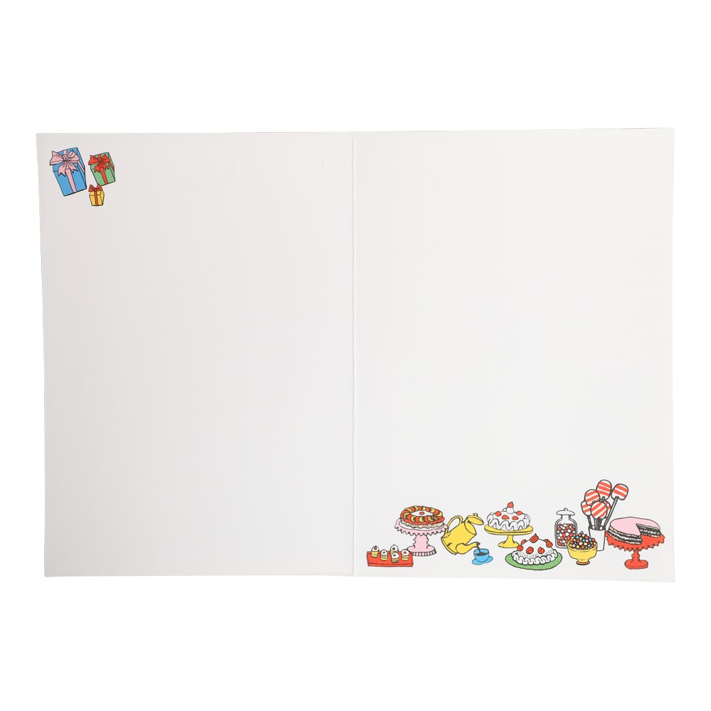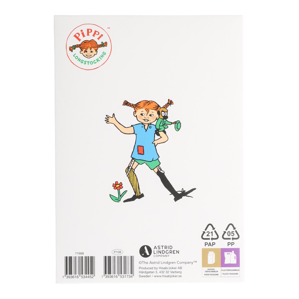 Aan de binnenkant van de kaart is er ruimte voor een persoonlijke boodschap en een kleine illustratie met cadeautjes en gebak die de kaart een extra feestelijk gevoel geven. Een perfecte kaart voor iedereen die houdt van de klassieke verhalen over Pippi Langkous.