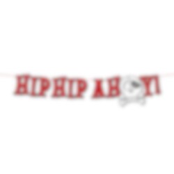 Creëer een speelse en feestelijke piratensfeer op het kinderfeestje met deze decoratieve slinger met de tekst "Hip Hip Ahoy!". De rode tekst en het klassieke doodshoofd maken het een prachtig detail dat perfect past bij een piratenfeestje of een piratenfeest.