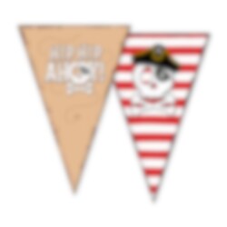 Creëer een echte piratensfeer op het kinderfeestje met deze vlaggenlijn in een leuk piratenthema. De driehoekige vlaggen hebben speelse afbeeldingen met een doodshoofd, piratenhoed, strepen en de tekst "Hip Hip Ahoy!", wat het een geschikte decoratie maakt voor zowel een kinderfeestje als een piratenfeest.