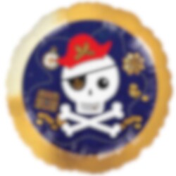 Folieballon in donkerblauwe kleur met goude folie randen en met motief van een Jolly Roger met schatten. Een mooie decoratie om mee te nemen naar je piraten kinderfeestje.