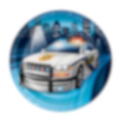 8 bordjes met motieven van een stoere politieauto. De bordjes zijn ongeveer 18 cm in doorsnee.