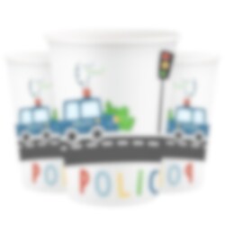 6 papieren bekers met politiemotief. De bekers zijn 9 cm hoog en hebben een inhoud van 200 ml.