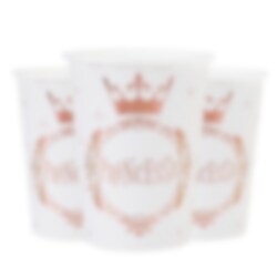 10 papieren bekers in een mooie witte kleur en met een leuk prinsessenmotief in roségoudfolie. Super leuk om bij je te hebben voor het dekken van de tafel voor je prinsessen-kinderfeestje. Combineer de bekers met bordjes, servetten en andere accessoires in hetzelfde thema voor de perfecte setting.