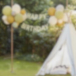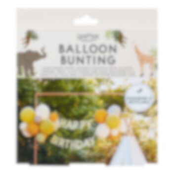 Decoratiepakket met ballonnen en een slinger met de tekst "Happy Birthday". Een stijlvolle decoratie voor op je junglefeestje of waarom niet op het zomerfeestje.