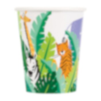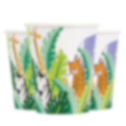 8 witte papieren bekers met motieven van schattige safaridieren in de jungle. Stijlvol om op tafel te zetten als het tijd is voor een kinderfeestje. Past mooi bij onze andere accessoires uit het safari thema.