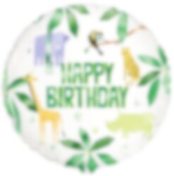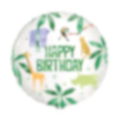 Leuke folieballon met schattige motieven van kleine safaridieren en groene blaadjes met de tekst Happy Birthday. Een leuke decoratie om mee te decoreren als het tijd is voor een kinderfeestje. Past perfect bij onze andere accessoires uit het thema safaridieren.