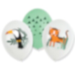 6 latex ballonnen in de kleuren wit en groen met schattige motieven van safari dieren. Perfecte decoraties om op te blazen voor een safari-kinderfeestje. De ballonnen hebben een diameter van ongeveer 27 cm wanneer ze zijn opgeblazen en opgeblazen met lucht of helium.