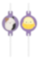 4 papieren rietjes met schattige afbeeldingen uit Squishmallows. De rietjes zijn ongeveer 21 cm lang en de motieven hebben een diameter van ongeveer 6,5 cm.