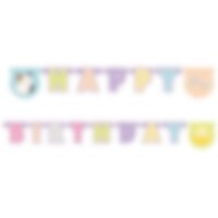 Mooie slinger van papier met de tekst "Happy Birthday" en afbeeldingen van Squishmallows. De slinger is 2 meter lang.