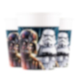 8 papieren bekers met stijlvolle afbeeldingen van de iconische slechteriken Darth Vader, Stormtrooper en Boba Fett uit de Star Wars-serie. Perfect om de tafel mee te versieren voor een Star Wars-kinderfeestje. Combineer de bekers met onze andere Star Wars Galaxy-tafelaccessoires. De bekers zijn ongeveer 10 cm hoog, hebben een inhoud van circa 200 ml en zijn FSC-gecertificeerd.