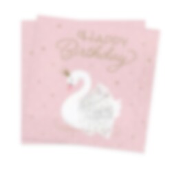 16 roze servetten met aan beide zijden een motief van een mooie zwaan en de tekst "Happy Birthday" en sterren in goud. De servetten hebben 2 lagen en zijn uitgevouwen 33 x 33 cm.