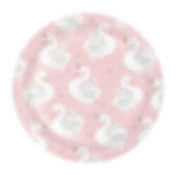 8 bordjes in een lichtroze kleur met een prachtig motief van zwanen en gouden sterren. Een passende tafelaanvulling voor het kinderfeestje met het thema Stylish Swan. De bordjes hebben een diameter van ongeveer 18 cm.