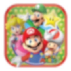 8 leuke vierkante bordjes met afbeeldingen van Mario, Luigi, Princess Peach en Toad uit Super Mario Bros. Perfect om lekkere broodjes en taart op te serveren tijdens een kinderfeestje. De bordjes zijn gemaakt van stevig papier en hebben een afmeting van ca. 18 cm.