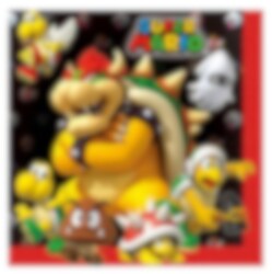 16 servetten met afbeeldingen van Bowser en zijn helpers uit de populaire gameserie Super Mario Bros. Perfect om op tafel te leggen bij taart of andere lekkernijen. De servetten zijn 2-laags en hebben een uitgevouwen formaat van ca. 33 x 33 cm.