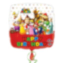 Decoratieve folieballon met de tekst 'Happy Birthday' en afbeeldingen van Mario en zijn vrienden uit de klassieke videogameserie Super Mario Bros. Versier de feestzaal hiermee. De ballon heeft een diameter van ongeveer 43 cm wanneer opgeblazen en kan worden gevuld met lucht of helium.