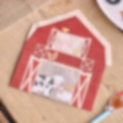 16 servetten in de vorm van schuren met dieren. De servetten hebben 2 lagen en zijn ongevouwen 16,5 x 15 cm.