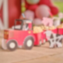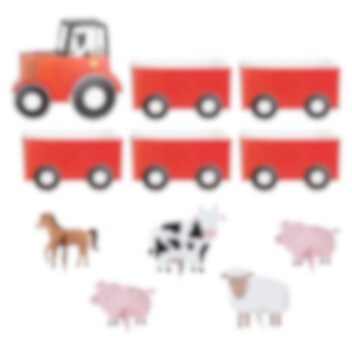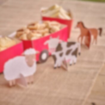 Grappige snackkraam die een tractor met 5 wagens voorstelt. De standaard werkt ook als tafeldecoratie.