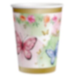 Deze elegante papieren bekers met gouden rand en een prachtig vlindermotief voegen een magische touch toe aan de feesttafel. De bekers hebben een inhoud van 250 ml en worden verkocht per 8 stuks.