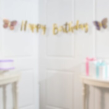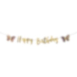 Superfijne slinger met afbeeldingen van vlinders en de tekst 'Happy Birthday' in pastelkleuren en goudfolie. De slinger is 2,13 meter lang en de afbeeldingen zijn 21 cm hoog.