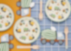 6 bordjes in prachtige kleuren met verschillende motieven van werkvoertuigen. Voor degenen die geïnteresseerd zijn in voertuigen en bouwplaatsen, zijn deze borden een voor de hand liggende keuze voor een schattig themafeest.