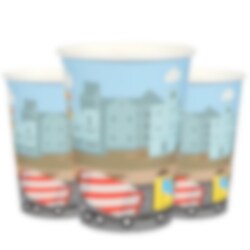 10 papieren bekers met motieven van werkvoertuigen. De bekers zijn 10 cm hoog en hebben een inhoud van 270 ml.
