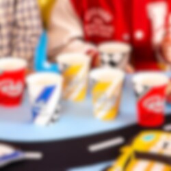 De bekers zijn gemaakt van papier, zijn circa 9 cm hoog en hebben een inhoud van ca. 270 ml.