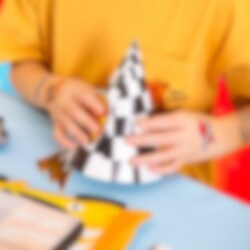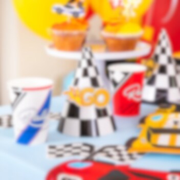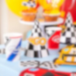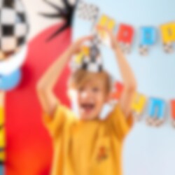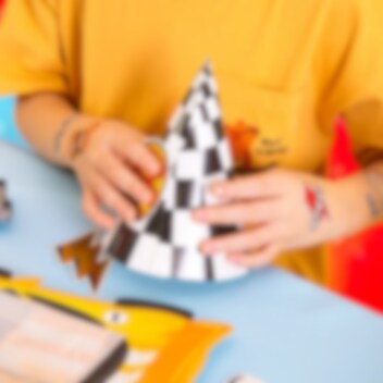 6 feesthoedjes in klassiek geblokt racing-patroon, perfect om op te zetten als de kleine racecoureur jarig is! De hoedjes worden eenvoudig in elkaar gezet en versierd met de meegeleverde bedrukte papieren decoraties in racing-thema, die worden vastgezet met lijmpunten.