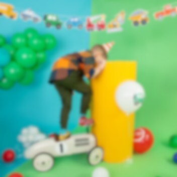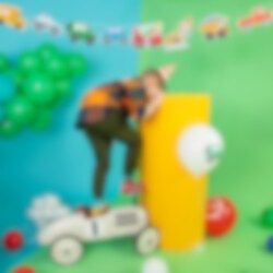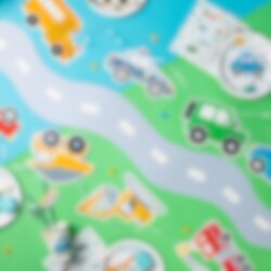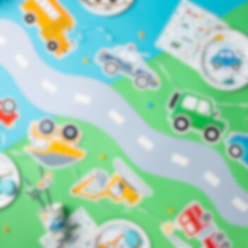 Decoratieve slinger van karton met verschillende kleurrijke voertuigen. Prachtig om op te hangen tijdens een kinderfeestje met een voertuigthema.