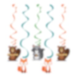 5 hangende kleurrijke decoraties met motieven van vossen, bevers en een wasbeer. Versier de feestzaal hiermee om indruk te maken op je vrienden wanneer het tijd is voor een dierenfeest. 3 van de decoraties zijn ongeveer 76 cm lang en 2 van de decoraties zijn ongeveer 99 cm lang.