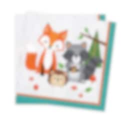 16 servetten in de kleuren wit, groen/blauw en oranje met motieven van bosdieren uit het schattige thema Woodland Animals. De servetten hebben 2 lagen en zijn uitgevouwen 33 x 33 cm.