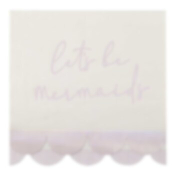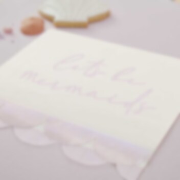 16 lichtroze servetten met parelmoer franjes die schubben nabootsen en in het midden het motief van de tekst "Let's be mermaids" in een roze kleur hebben. Heerlijk om bij je te hebben om de tafel te dekken voor het zeemeerminnen-kinderfeestje.