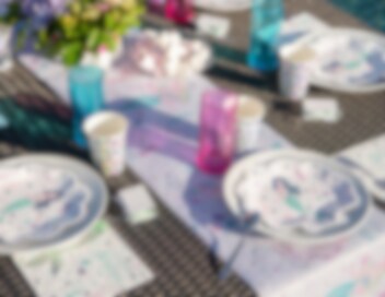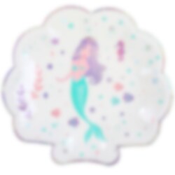 10 schelpvormige bordjes in een witte kleur met zilver folie randen en met een motief van een lieve zeemeermin omgeven door kleurrijke planten en schelpen uit de zee. Perfect om op tafel te zetten voor het zeemeerminnen kinderfeestje. Combineer de bordjes met bekers en servetten uit hetzelfde thema.