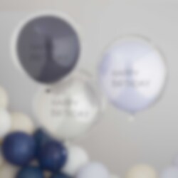 3 stuks stoere ballonnen met dubbele lagen in blauw/grijstinten en met de tekst Happy Birthday. Super leuk om te hebben als het tijd is om je verjaardag te vieren! De ballonnen kunnen worden opgeblazen met lucht of met helium en hebben een diameter van ongeveer 45 cm wanneer ze volledig zijn opgeblazen.