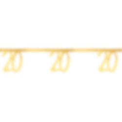 Decoratieve slinger van karton met glanzende goudfolie en het getal '20'. De slinger is een uitstekende decoratie voor je 20-jarige feest. Elk getal is 18 x 23 cm groot en de slinger zelf is 250 cm lang.
