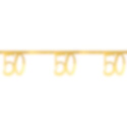 Decoratieve slinger van karton met glanzende goudfolie en het getal '50'. De slinger is een uitstekende decoratie voor je 50-jarige feest. Elk getal is 18 x 23 cm groot en de slinger zelf is 250 cm lang.