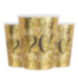 10 glinsterende papieren bekers in goud met het getal '20'. Deze bekers zijn echt heerlijk en een vanzelfsprekend onderdeel van de tafelschikking voor het 20-jarig feest. De bekers zijn ongeveer 10 cm hoog en hebben een inhoud van ongeveer 270 ml.