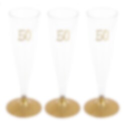 6 stuks mooie en praktische wegwerpglazen in champagnestijl. De plastic glazen zijn leuk om zowel de tafel mee te dekken als om mee te mengen met je gasten op het 50e verjaardagsfeest. De glazen hebben een inhoud van 14 cl. en staan op een gouden voet en hebben het getal '50' bovenaan gedrukt.