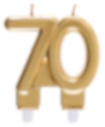Taartkaars in goud, elegant gevormd als het getal '70'. De taartkaars heeft een afmeting van 7,5 x 9 cm.