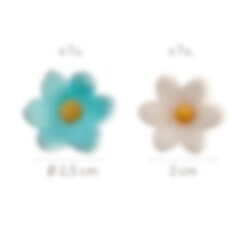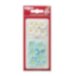 14 prachtige suikerdecoraties in een mix van blauwe en witte bloemetjes met een gele kern – perfect voor stijlvolle decoratie van cupcakes, taarten en ander gebak.